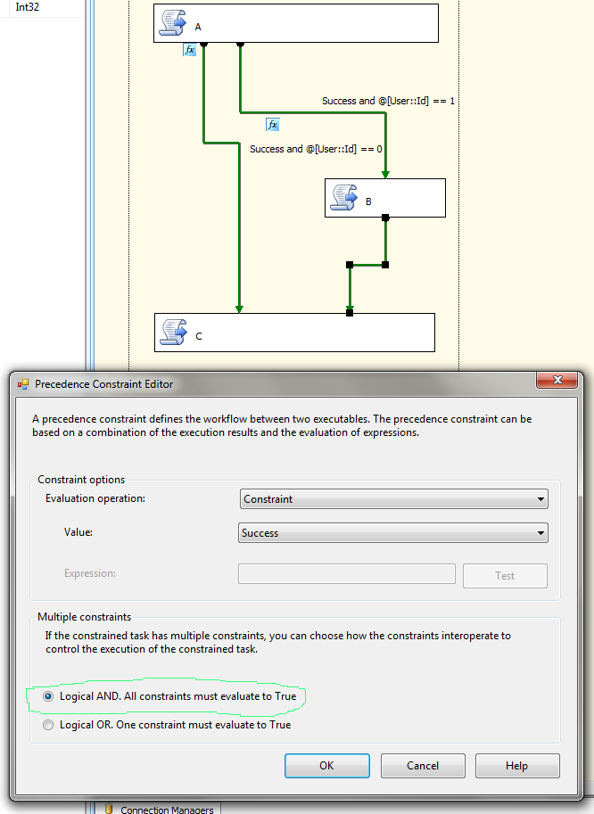 The solution: Select the "Logical OR" option so that C will run if either of its input connectors conditions/expressions are true. This will turn both the connectors joining to C into dotted lines as shown in the figure below.